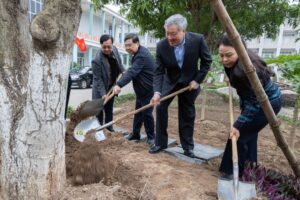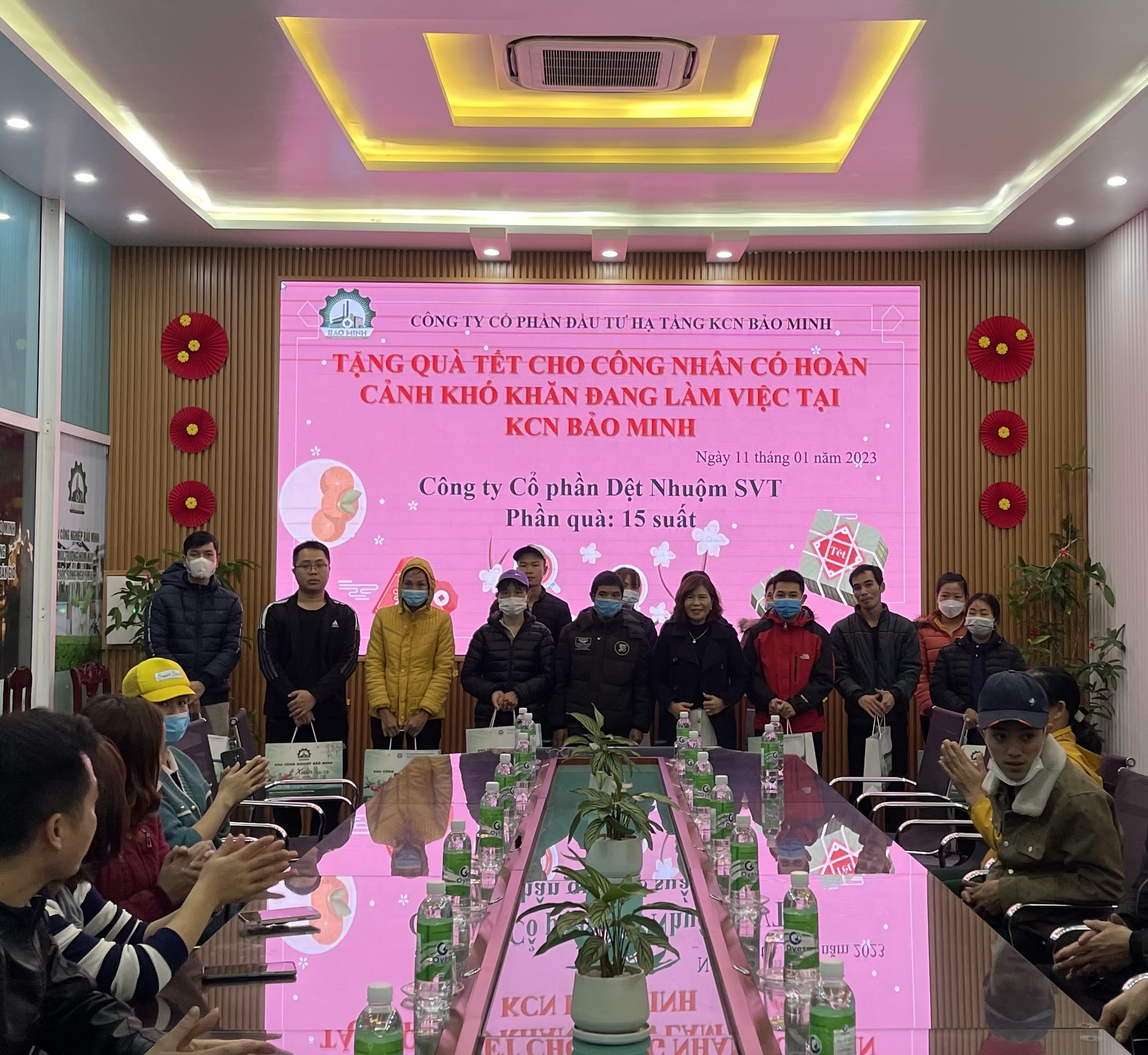 Đồng chí Nguyễn Hòa Bình, Ủy viên Bộ Chính trị, Bí thư Trung ương Đảng, Chánh án TAND tối cao và các đồng chí Ủy viên BCH Trung ương Đảng: Nguyễn Thị Thu Hà, Phó Chủ tịch, Tổng Thư ký Ủy ban Trung ương MTTQ Việt Nam; Nguyễn Đình Khang, Chủ tịch Tổng Liên đoàn Lao động Việt Nam; Phạm Gia Túc, Bí thư Tỉnh ủy dự lễ trao tặng quà cho công nhân Khu công nghiệp Bảo Minh (Vụ Bản).