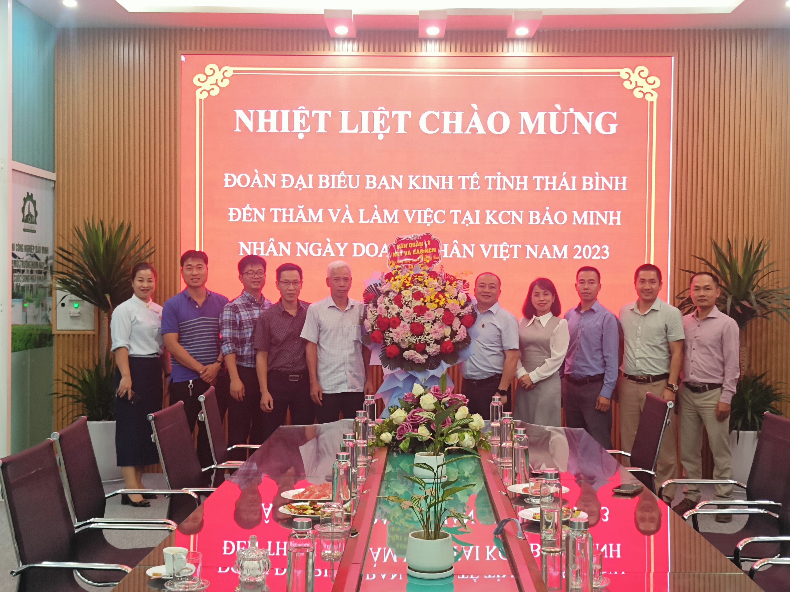 Đoàn đại biểu BQL khu tinh tế và các KCN tỉnh Thái Bình gửi đến công ty lời chúc tốt đẹp và thành đạt nhân ngày doanh nhân Việt Nam, thông qua buổi gặp gỡ cũng ông Phạm Xuân Hán – Phó trưởng ban quản lý cũng mong muốn sự hợp tác và kết nối giữa công ty đưa các Khu công nghiệp tại Thái Bình nói riêng và các dự án của công ty CPĐT Hạ tầng KCN Bảo Minh nhanh chóng triển khai theo tiến độ và đi vào hoạt động góp tăng tỷ trọng công nghiệp của toàn vùng.