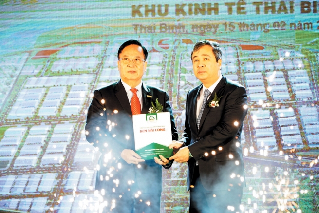 Bí thư Tỉnh ủy Thái Bình – ông Ngô Đông Hải trao quyết định chủ trương đầu tư dự án của Thủ tướng Chính phủ cho lãnh đạo Công ty Cổ phần Đầu tư hạ tầng KCN Bảo Minh – nhà đầu tư hạ tầng KCN Hải Long